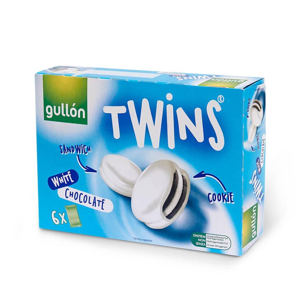 As Twins cobertas com Chocolate Branco. São bolachas com creme banhadas em chocolate branco. Na caixa há 6 pacotes individuais.